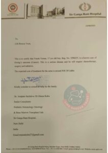 This is an earnest appeal to save the life of Master Vansh, a 17-year-old boy (UHID No. 3596255) who has been diagnosed with Ewing’s Sarcoma, a type of cancer. He is currently undergoing treatment at Sir Ganga Ram Hospital, New Delhi.